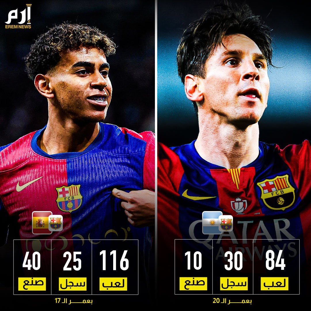65 مساهمة تهديفية للشاب لامين يامال مقابل 40 فقط للأسطورة ليونيل ميسي. لامين بعمر ال17 يتفوق على ميسي بعمر ال20