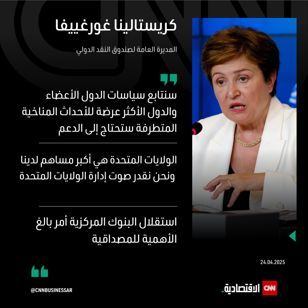 مديرة صندوق النقد الدولي جورجيفا: سنتابع سياسات الدول الأعضاء، والدول الأكثر عرضة للأحداث المناخية المتطرفة ستحتاج إلى الدعم #العالم_بلغة_الأعمال