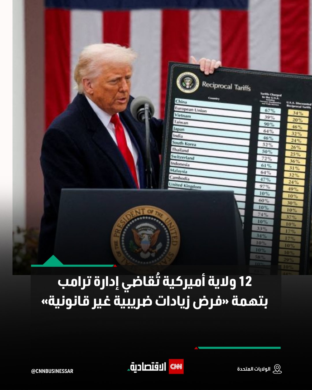 رفعت 12 ولاية دعوى قضائية ضد إدارة ترامب، أمس الأربعاء، بتهمة «فرض زيادات ضريبية غير قانونية» على الأميركيين من خلال الرسوم الجمركية.