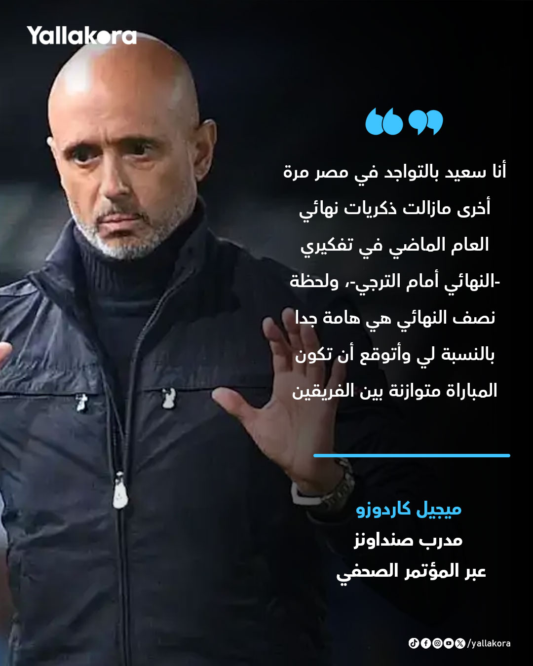 مدرب صنداونز. "أنا سعيد بالتواجد في مصر مرة أخرى مازالت ذكريات نهائي العام الماضي في تفكيري -النهائي أمام الترجي-، ولحظة نصف النهائي هي هامة جدا بالنسبة لي وأتوقع أن تكون المباراة متوازنة بين الفريقين"