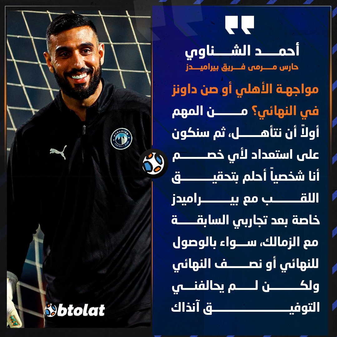أحمد الشناوي: مواجهة الأهلي أو صن داونز في النهائي؟ سنكون على استعداد لأي خصم وأنا شخصياً أحلم بتحقيق اللقب مع بيراميدز، خاصة بعد تجاربي السابقة مع الزمالك