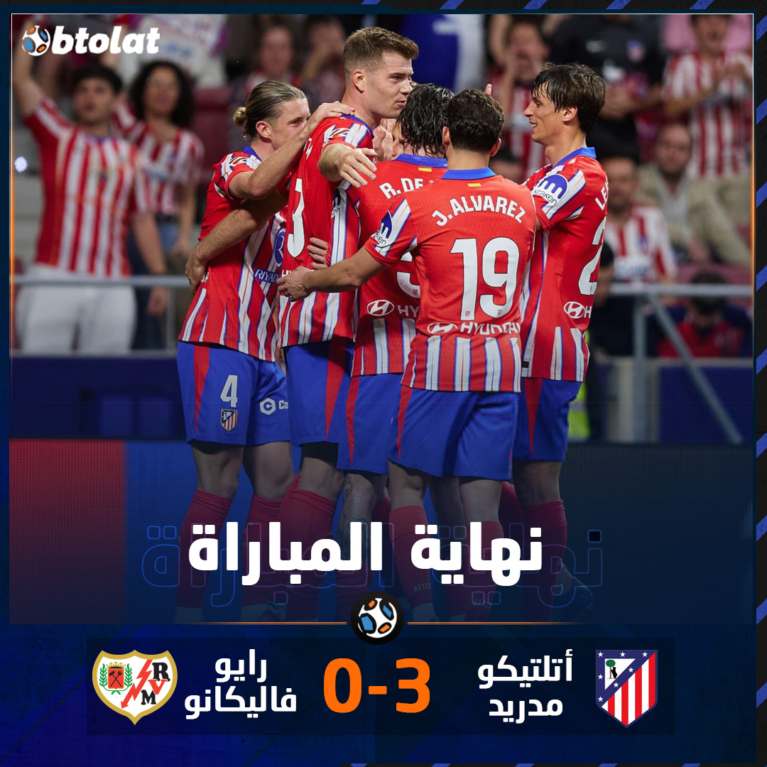 نهاية المباراة! أتلتيكو مدريد يدك شباك رايو فاليكانو بثلاثية نظيفة ضمن الجولة ال33 من الدوري الإسباني ليرفع رصيده إلى 66 نقطة بالمركز الثالث