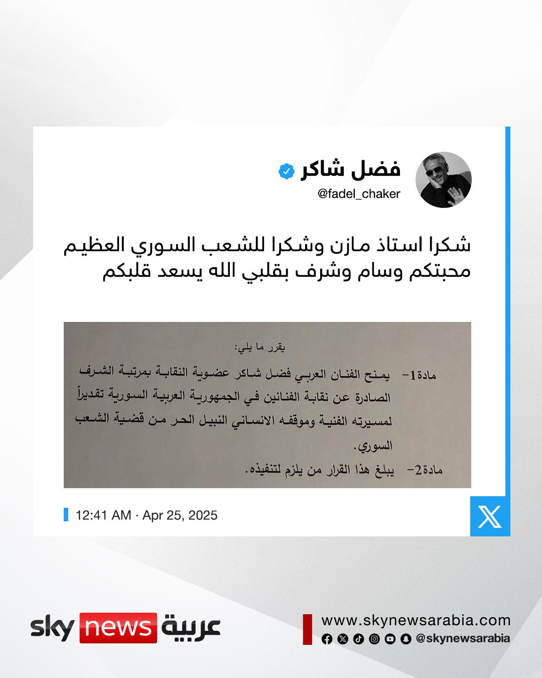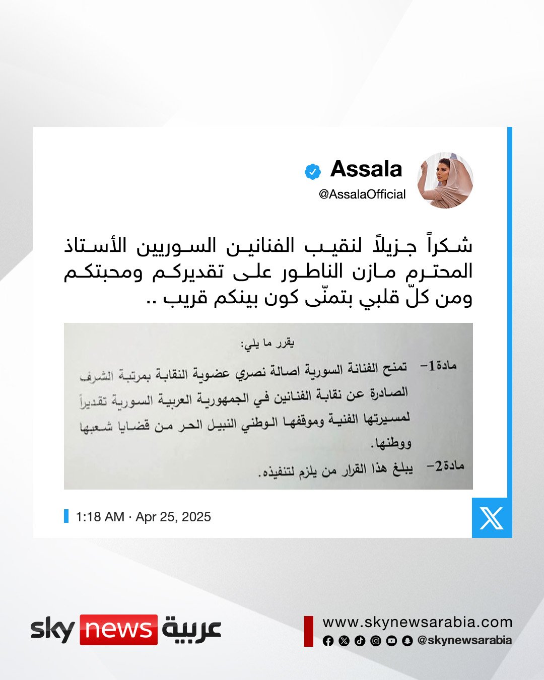 نقابة الفنانين السوريين تمنح أربعة فنانين بينهم أصالة وفضل شاكر عضويتها الفخرية مع مرتبة الشرف #أصالة