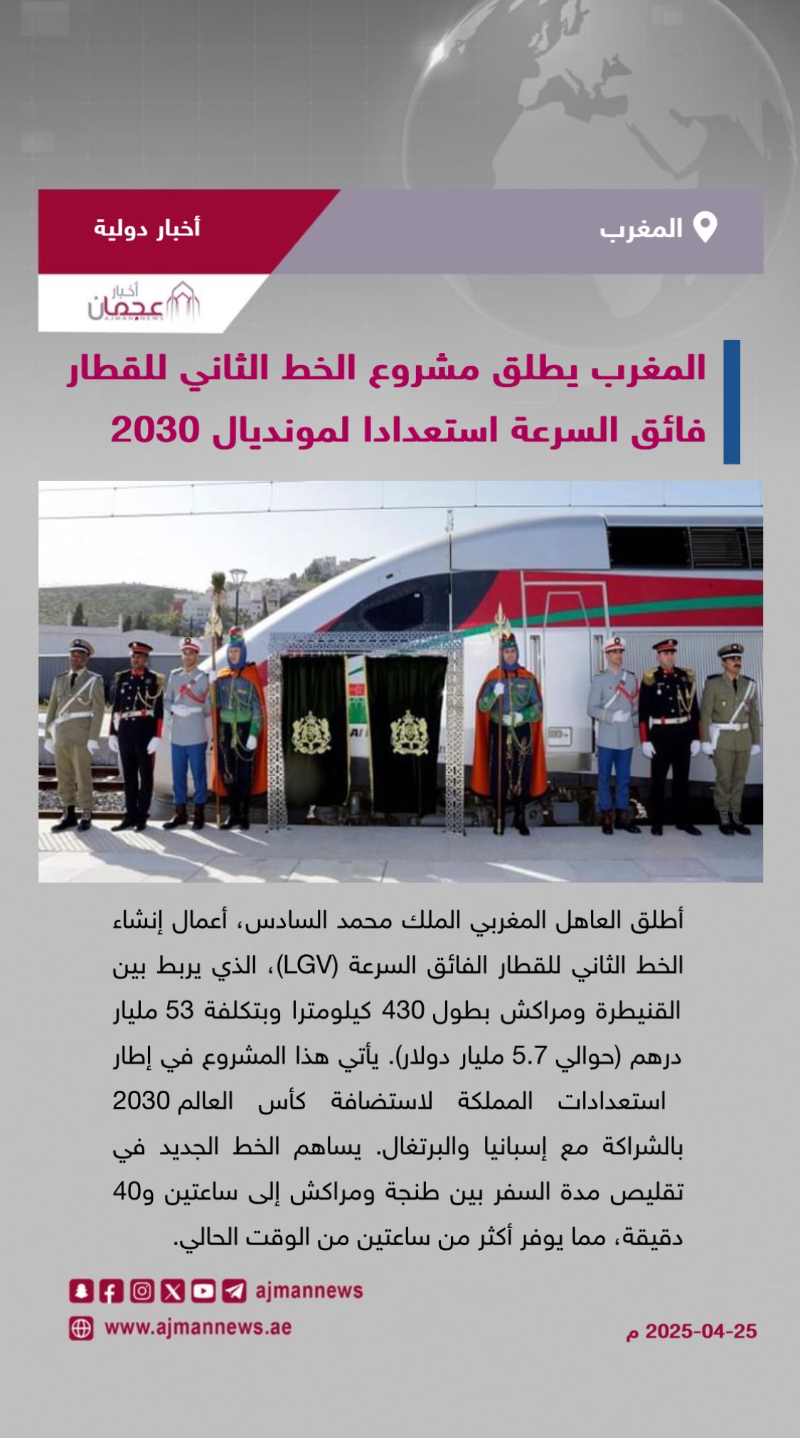 أطلق العاهل المغربي الملك محمد السادس، "الخميس"، أعمال إنشاء الخط الثاني للقطار الفائق السرعة (LGV)، الذي يربط بين القنيطرة ومراكش بطول 430 كيلومترا وبتكلفة 53 مليار درهم (حوالي 5.7 مليار دولار).