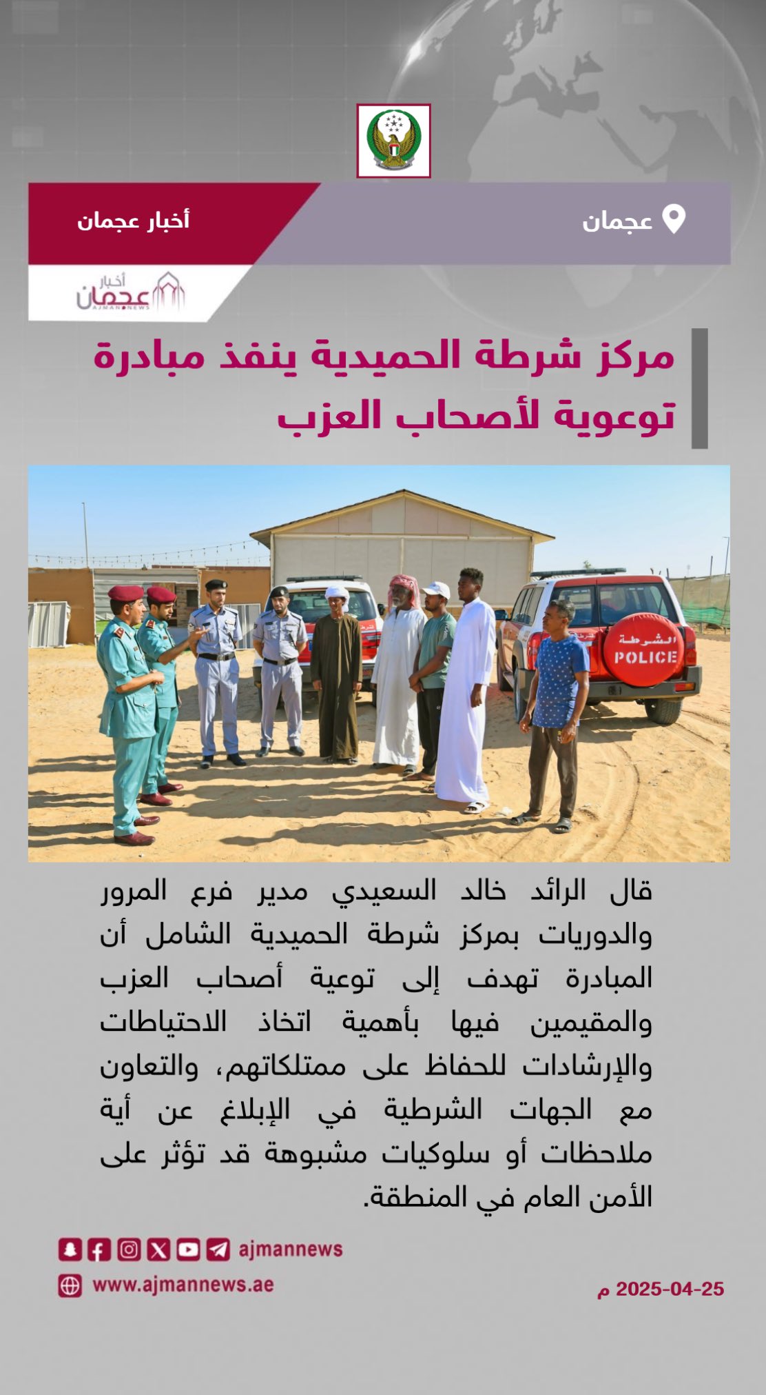في إطار حرص شرطة عجمان على تعزيز التواصل المجتمعي ونشر الوعي الأمني، نفذ مركز شرطة الحميدية الشامل مبادرة ميدانية لتقديم النصح والإرشاد لأصحاب العزب الواقعة بالقرب من مضمار التلة في عجمان.