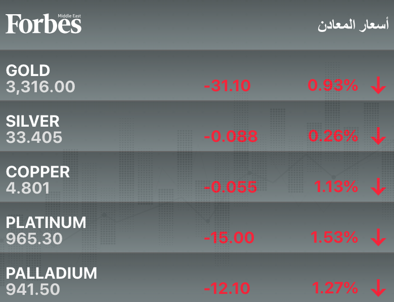 وتراجع الذهب بنسبة 0.9% إلى 3315.80 دولار للأونصة، فيما تراجعت الفضة بنسبة 0.3% إلى 33.495 دولار للأونصة، وانخفض البلاتين 1.45% إلى 966.1 دولار، في حين هبط البلاديوم 1.2% ليسجل 941.5 دولار.