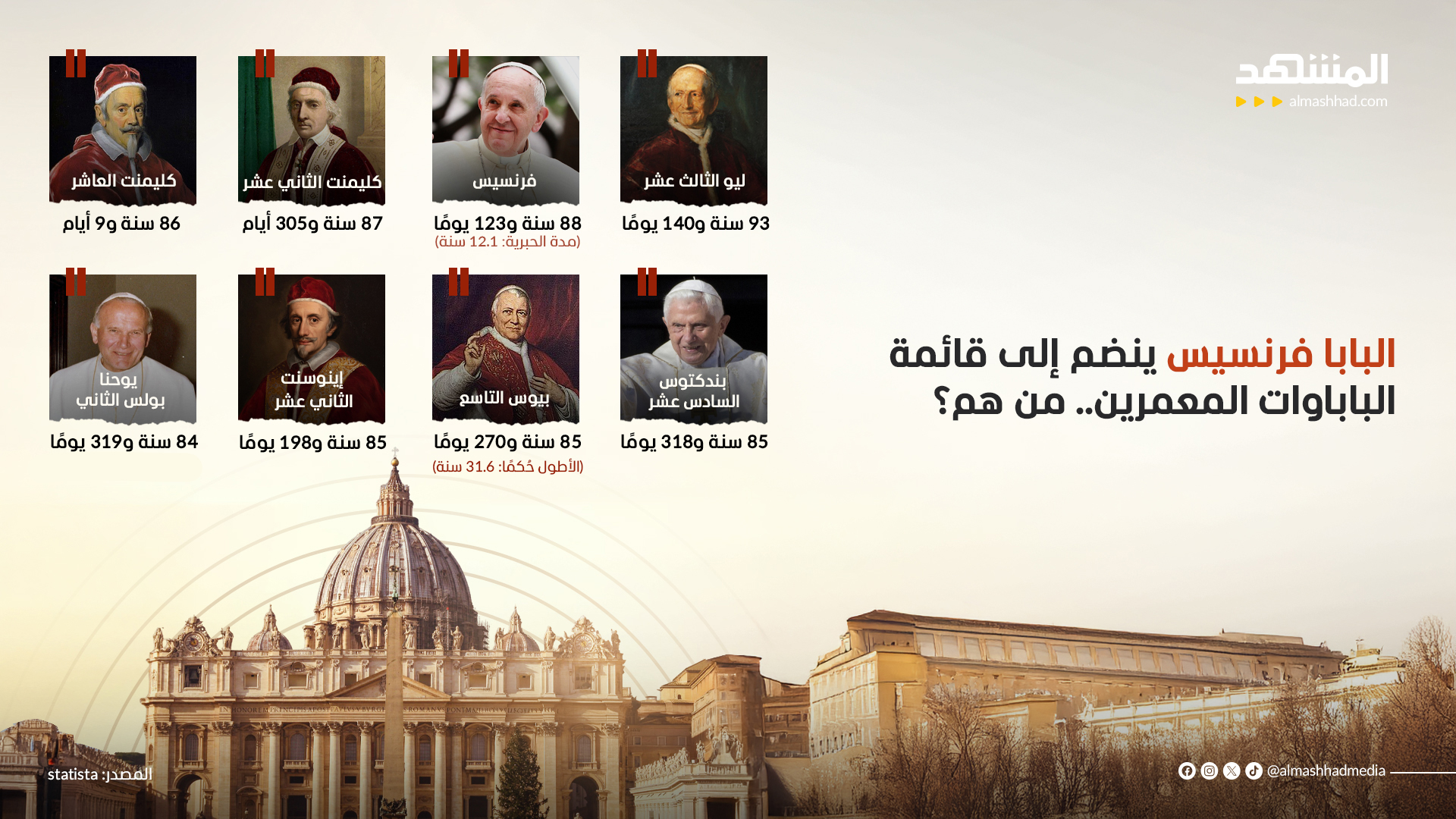 تعرفوا على أبرز الباباوات الذين عاشوا لأطول فترة في تاريخ الفاتيكان #اخبار_المشهد
