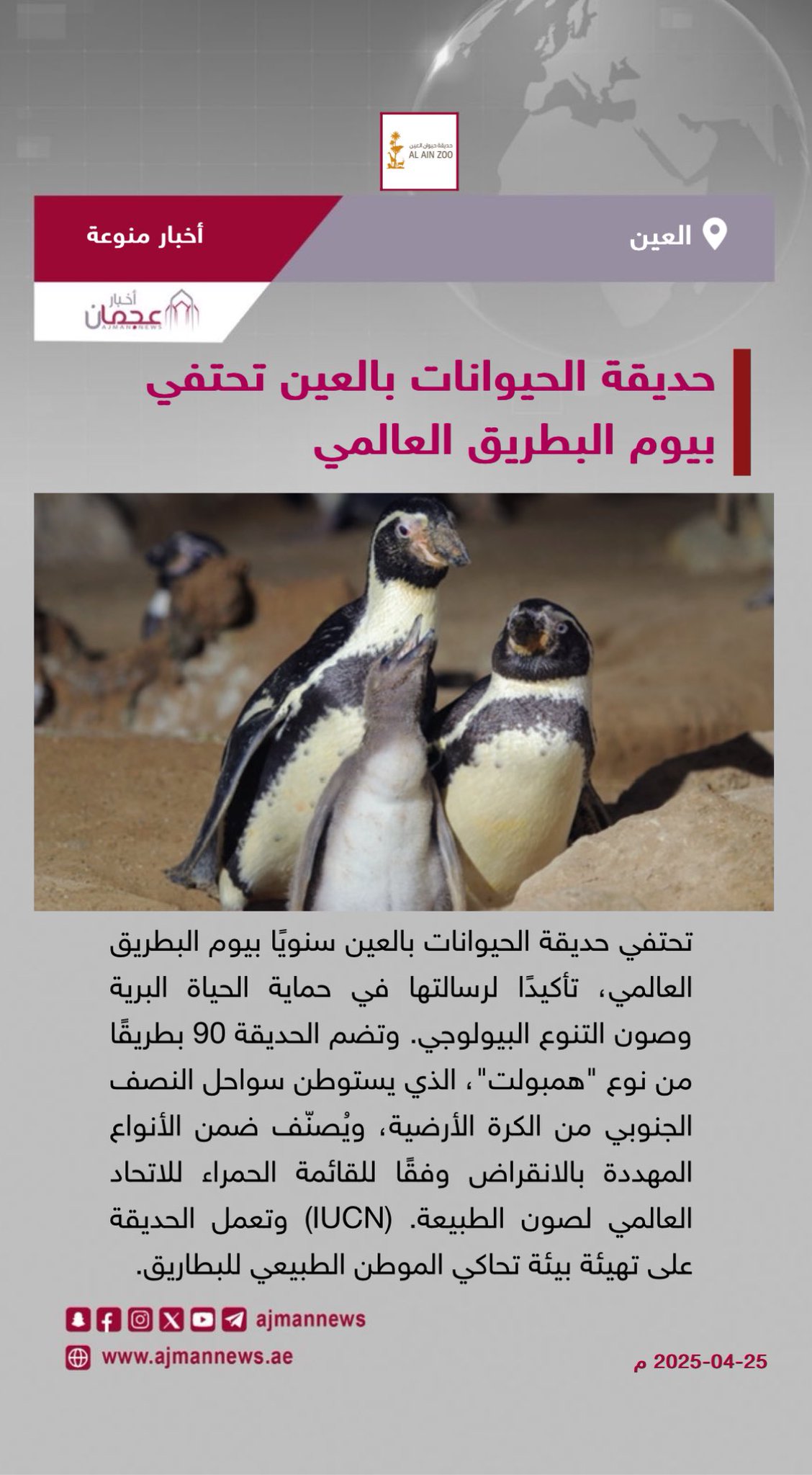 تحتفي حديقة الحيوانات بالعين سنويًا بيوم البطريق العالمي، تأكيدًا لرسالتها في حماية الحياة البرية وصون التنوع البيولوجي. وتضم الحديقة 90 بطريقًا من نوع "همبولت"، الذي يستوطن سواحل النصف الجنوبي من الكرة الأرضية، ويُصنّف ضمن الأنواع المهددة بالانقراض وفقًا للقائمة الحمراء للاتحاد العالمي لصون الطبيعة. (IUCN)