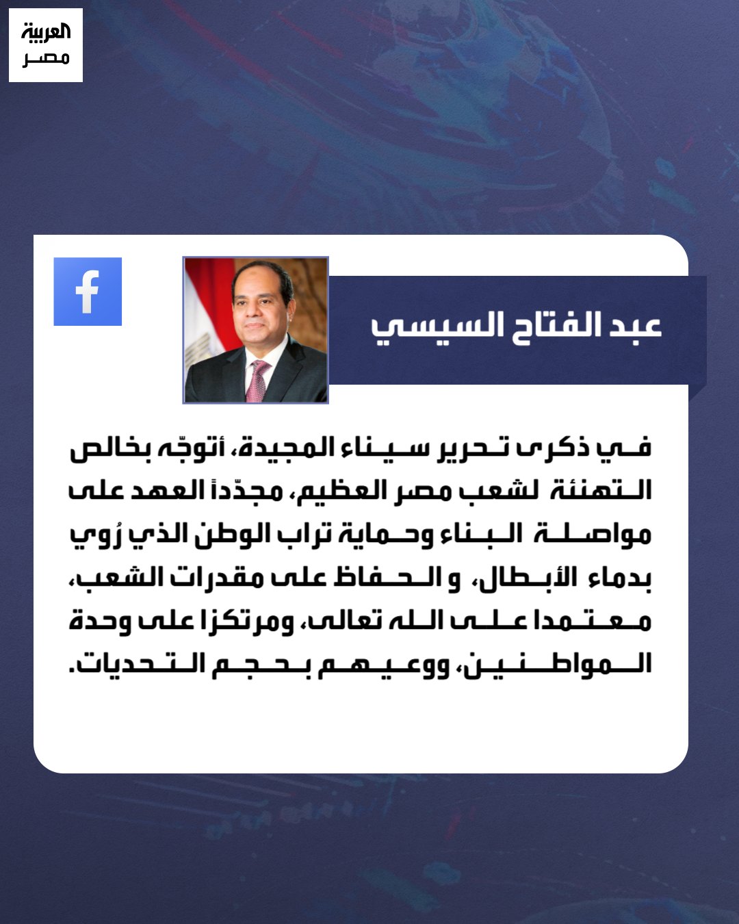 الرئيس عبدالفتاح السيسي عبر فيسبوك: "في ذكرى تحرير سيناء، أتوجَّه بخالص التهنئة لشعب مصر العظيم" _مصر