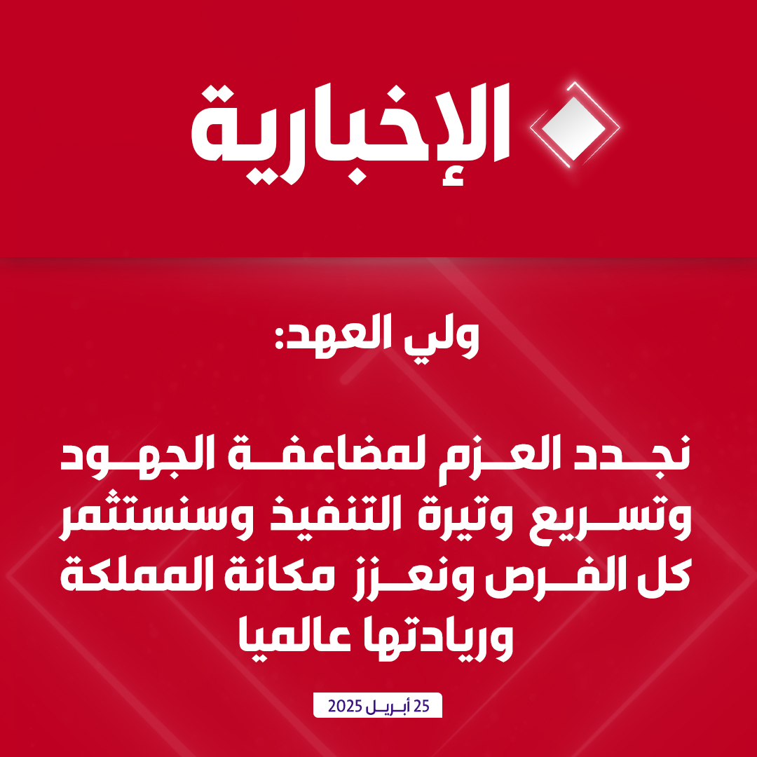 عاجل | ولي العهد: نجدد العزم لمضاعفة الجهود وتسريع وتيرة التنفيذ وسنستثمر كل الفرص ونعزز مكانة المملكة وريادتها عالميا #الإخبارية