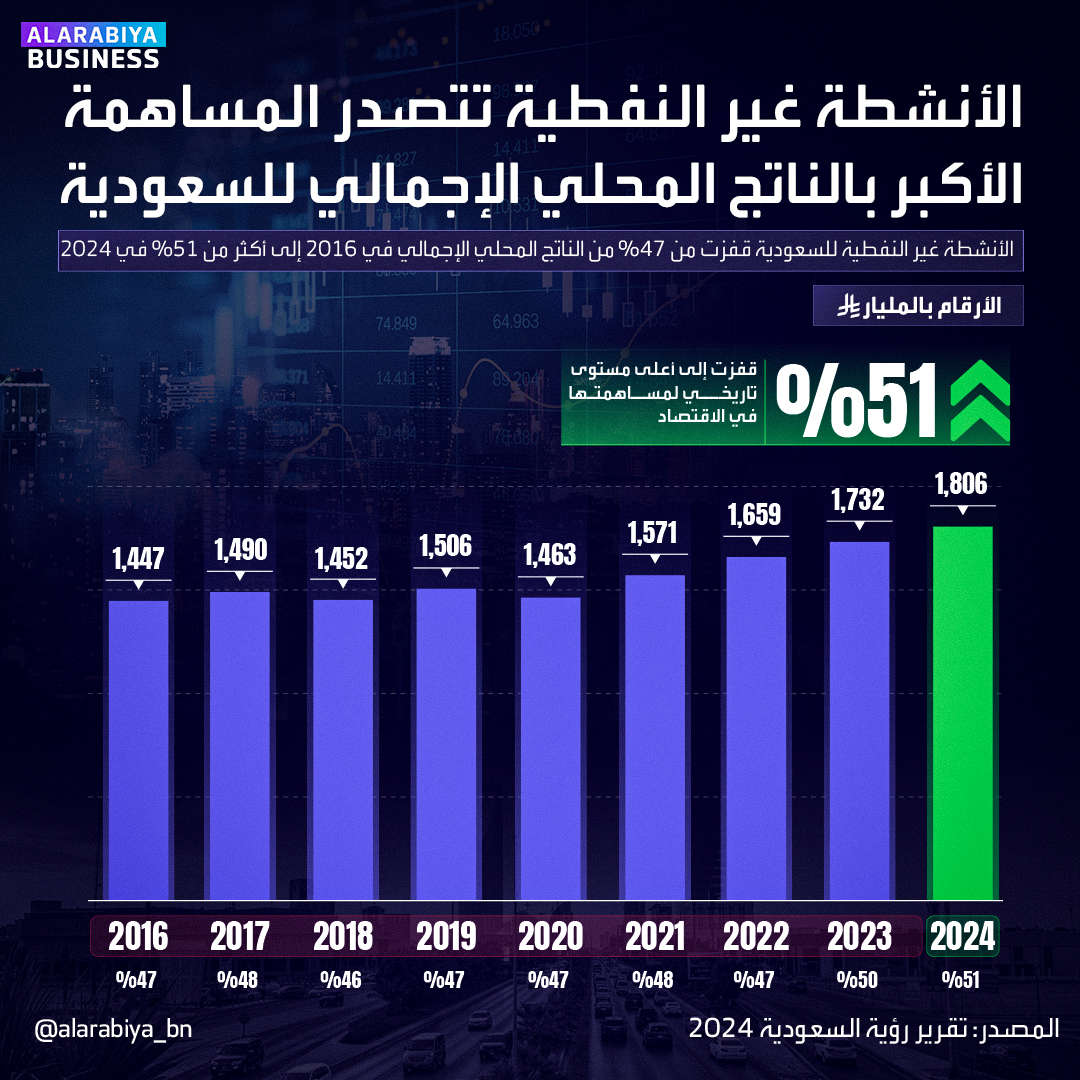 الأنشطة غير النفطية ل السعودية قفزت من 47٪ من الناتج المحلي الإجمالي في 2016 إلى أكثر من 51٪ في 2024 _Business