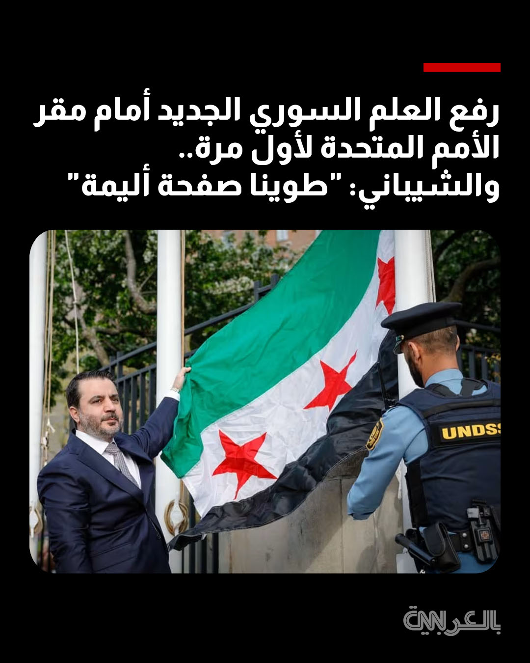 وقال الشيباني في منشور عبر حسابه على منصة "إكس"، تويتر سابقا: "باسم الجمهورية العربية السورية، أقف اليوم في لحظة تاريخية تفيض بالكرامة، لأرفع علمنا السوري الجديد في هذا الصرح الأممي، للمرة الأولى بعد أن طوينا صفحة أليمة من تاريخنا".