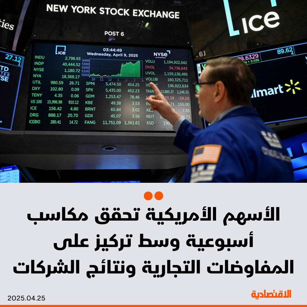 ارتفعت الأسهم الأمريكية اليوم مسجلة مكاسب أسبوعية مع تحليل المستثمرين لنتائج الشركات وبحثهم عن مؤشرات على تخفيف التوتر التجاري بين الولايات المتحدة والصين - صعد مؤشرا ستاندرد آند بورز وناسداك بفضل المكاسب التي حققتها مجموعة "العظماء السبعة" في حين كان مؤشر داو جونز الصناعي أكثر هدوءا