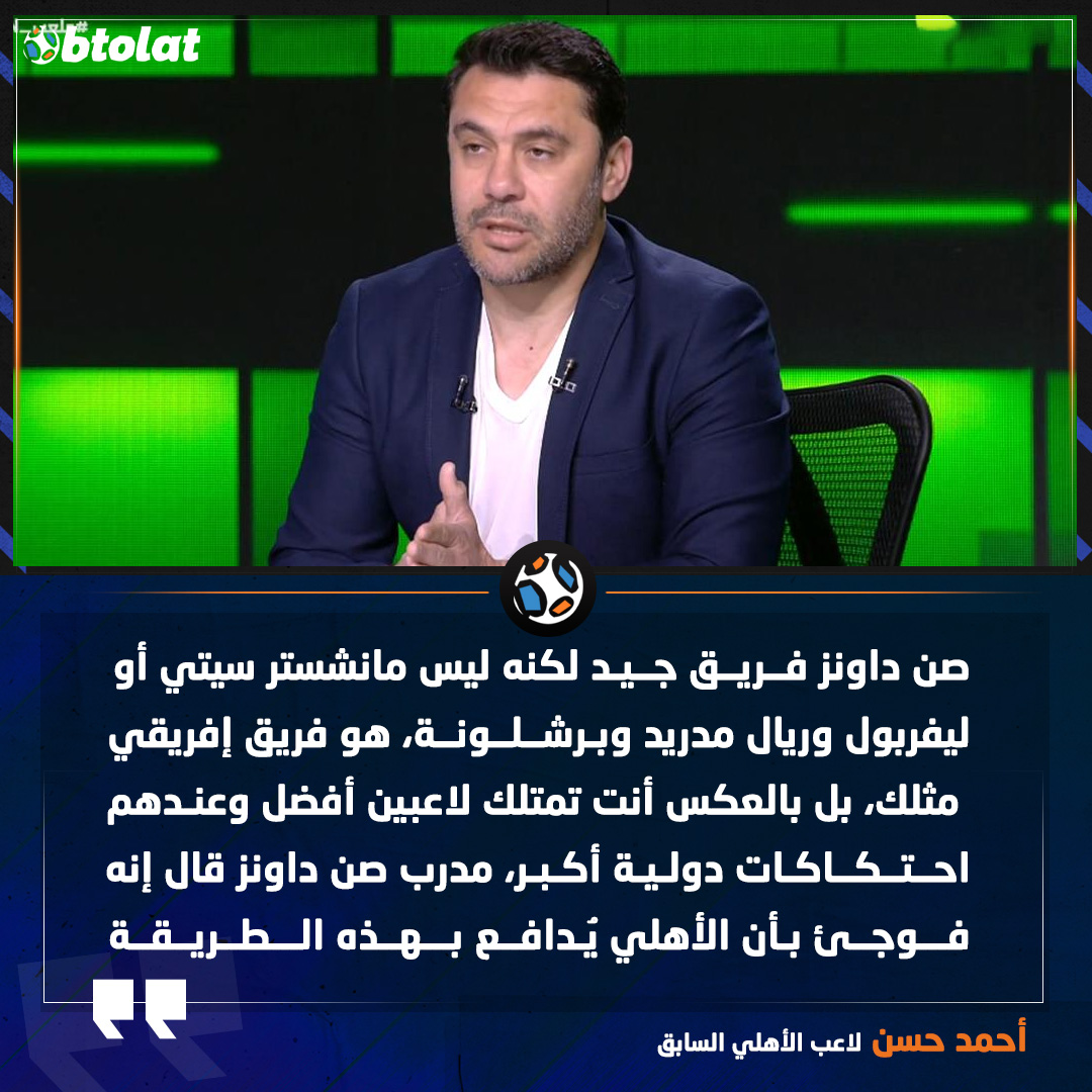 أحمد حسن. صن داونز فريق جيد لكنه ليس مانشستر سيتي أو ليفربول وريال مدريد وبرشلونة، هو فريق إفريقي مثلك، بل بالعكس أنت تمتلك لاعبين أفضل وعندهم احتكاكات دولية أكبر