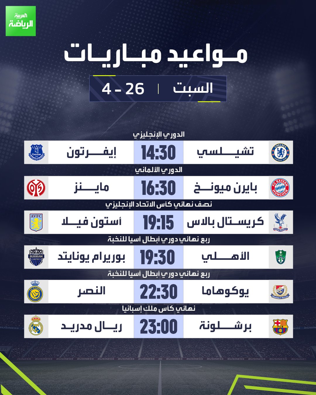 مباريات السبت. تشيلسي يلاقي إيفرتون ضمن الجولة 34 من الدوري الإنجليزي. بايرن ميونخ يسعى لتعزيز صدارته في الدوري الألماني أمام ماينز. الأهلي أمام بوريرام والنصر يواجه يوكوهاما في ربع نهائي دوري أبطال آسيا للنخبة. مواجهة قوية بين برشلونة وريال مدريد في نهائي كأس ملك إسبانيا