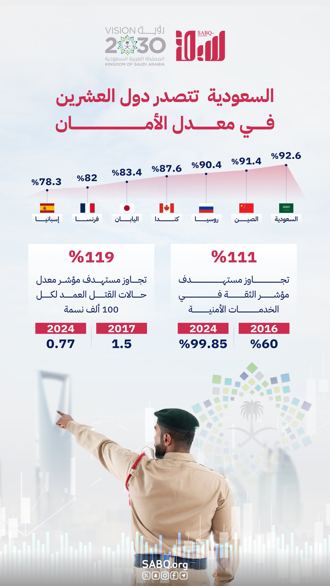 تصدرت المملكة دول مجموعة العشرين في مؤشر الأمان، الذي يقيس نسبة السكان الذين يشعرون بالأمان أثناء السير ليلًا بمفردهم #رؤية_السعودية_2030