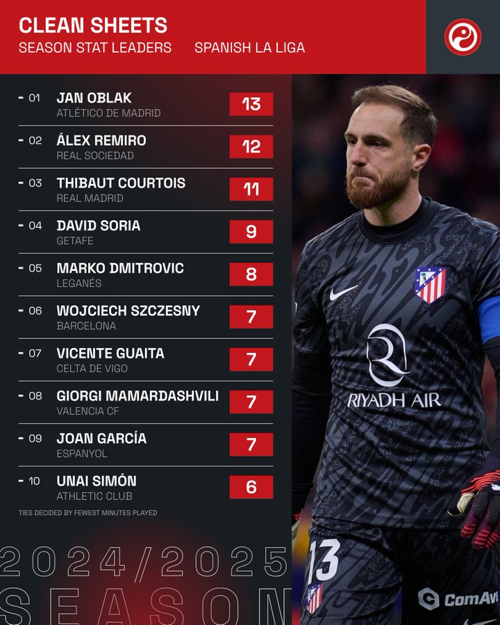 يان أوبلاك يثبت تألقه هذا الموسم في الدوري الإسباني، بحفاظه على نظافة شباكه أكثر من أي حارس آخر، ليؤكد جدارته بين نخبة حراس الليغا