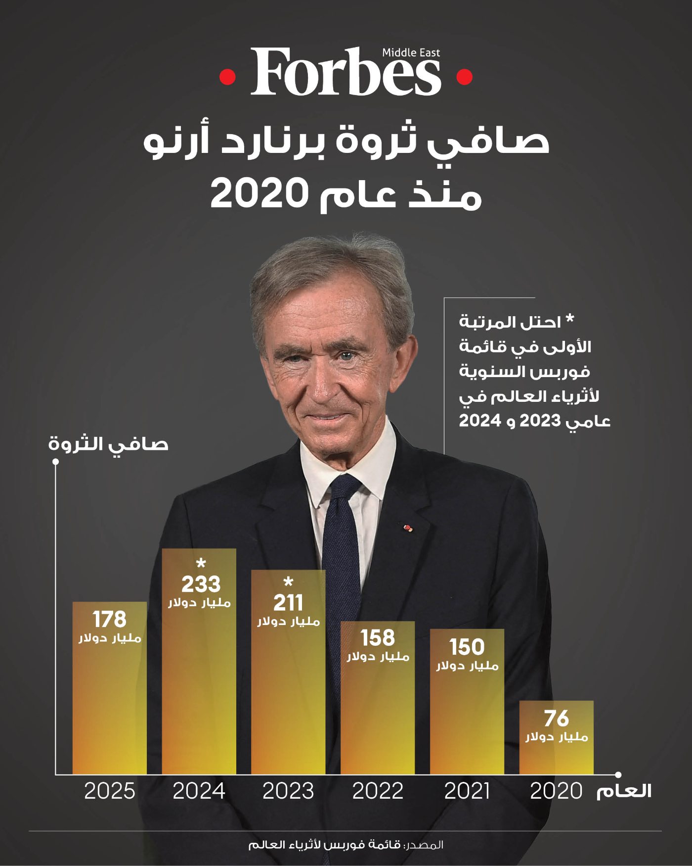 يُعد أرنو، وهو مهندس مدني مؤهل، أغنى شخص في صناعة الأزياء في العالم. ووفقًا لقائمة فوربس لأثرياء العالم لعام 2025 انخفض صافي ثروة قطب السلع الفاخرة الفرنسي بمقدار 55 مليار دولار إلى 178 مليار دولار، محتلاً المركز الخامس - وهو أدنى ترتيب له منذ عام 2017 - في ظل انخفاض أسهم LVMH وتوصيف مجموعته للوضع الراهن بـ"بيئة اقتصادية وجيوسياسية صعبة" تؤثر في القطاع.