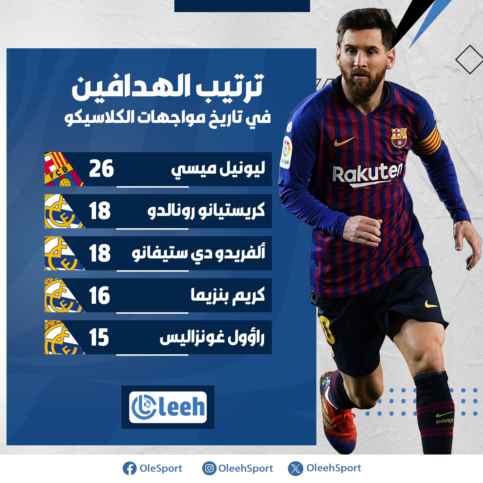 ليونيل ميسي يتربع على عرش الهدافين التاريخيين في مواجهات الكلاسيكو بين ريال مدريد وبرشلونة بجميع المسابقات