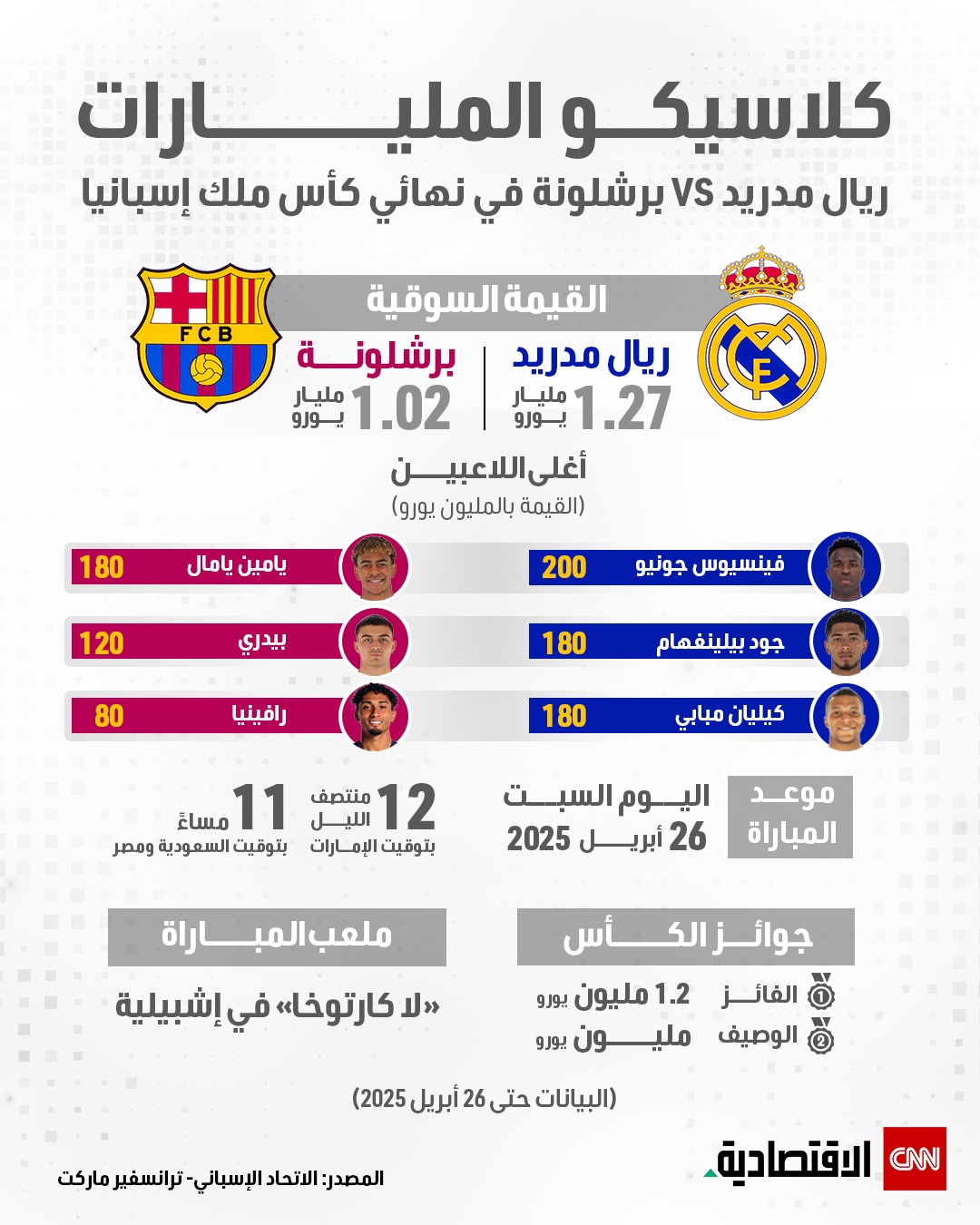 قبل نهائي كأس ملك إسبانيا بين ريال مدريد وبرشلونة.. تعرف على القيمة السوقية لكلا الفريقين #العالم_بلغة_الأعمال