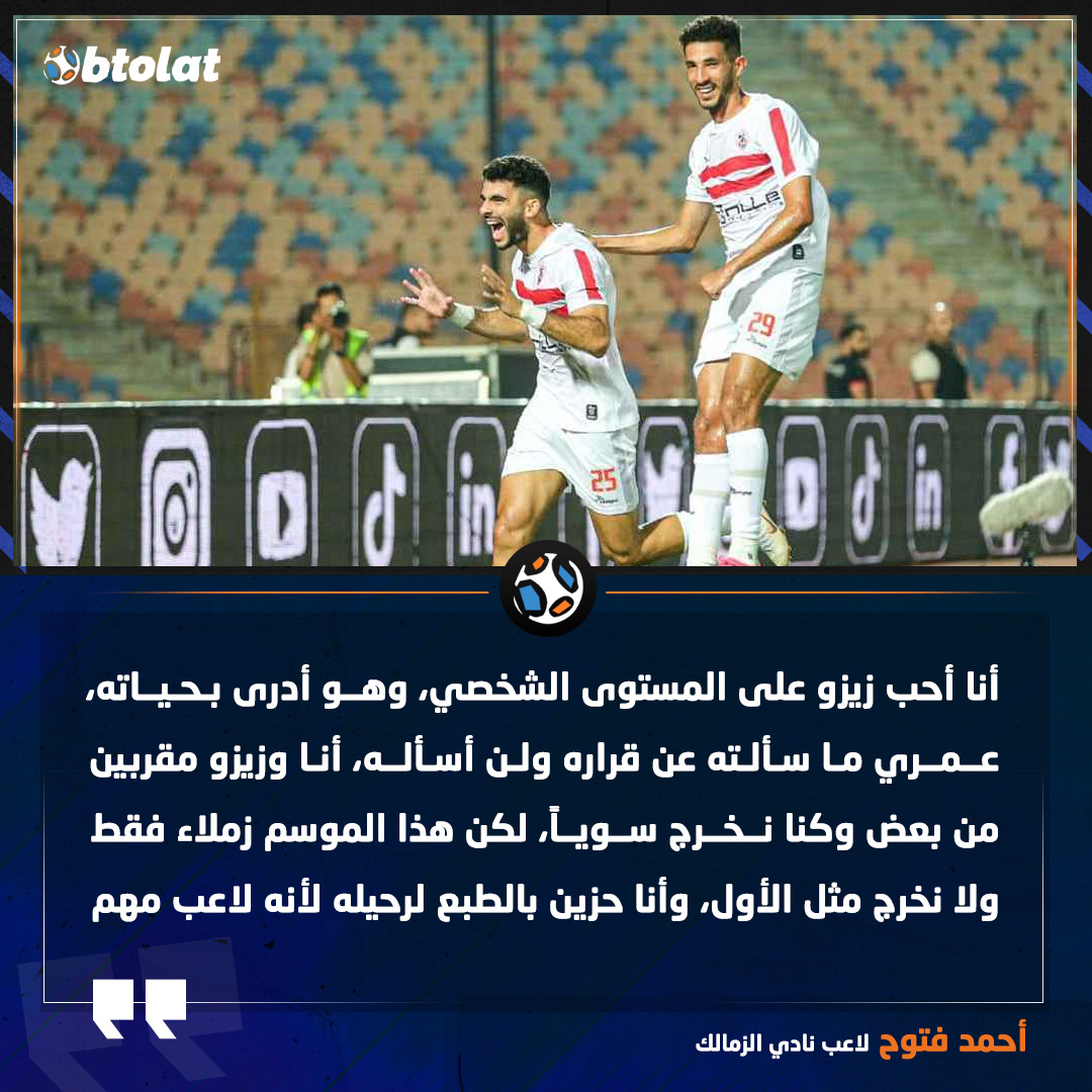 أحمد فتوح. أنا أحب زيزو على المستوى الشخصي، وهو أدرى بحياته، عمري ما سألته عن قراره ولن أسأله، أنا وزيزو مقربين من بعض وكنا نخرج سوياً، لكن هذا الموسم زملاء فقط