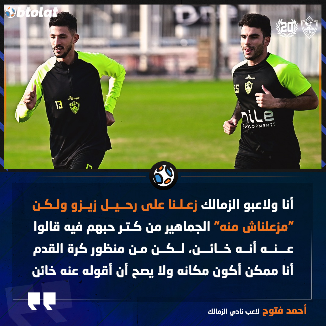 أحمد فتوح. أنا ولاعبو الزمالك زعلنا على رحيل زيزو ولكن "مزعلناش منه" الجماهير من كتر حبهم فيه قالوا عنه أنه خائن، لكن من منظور كرة القدم أنا ممكن أكون مكانه ولا يصح أن أقوله عنه خائن