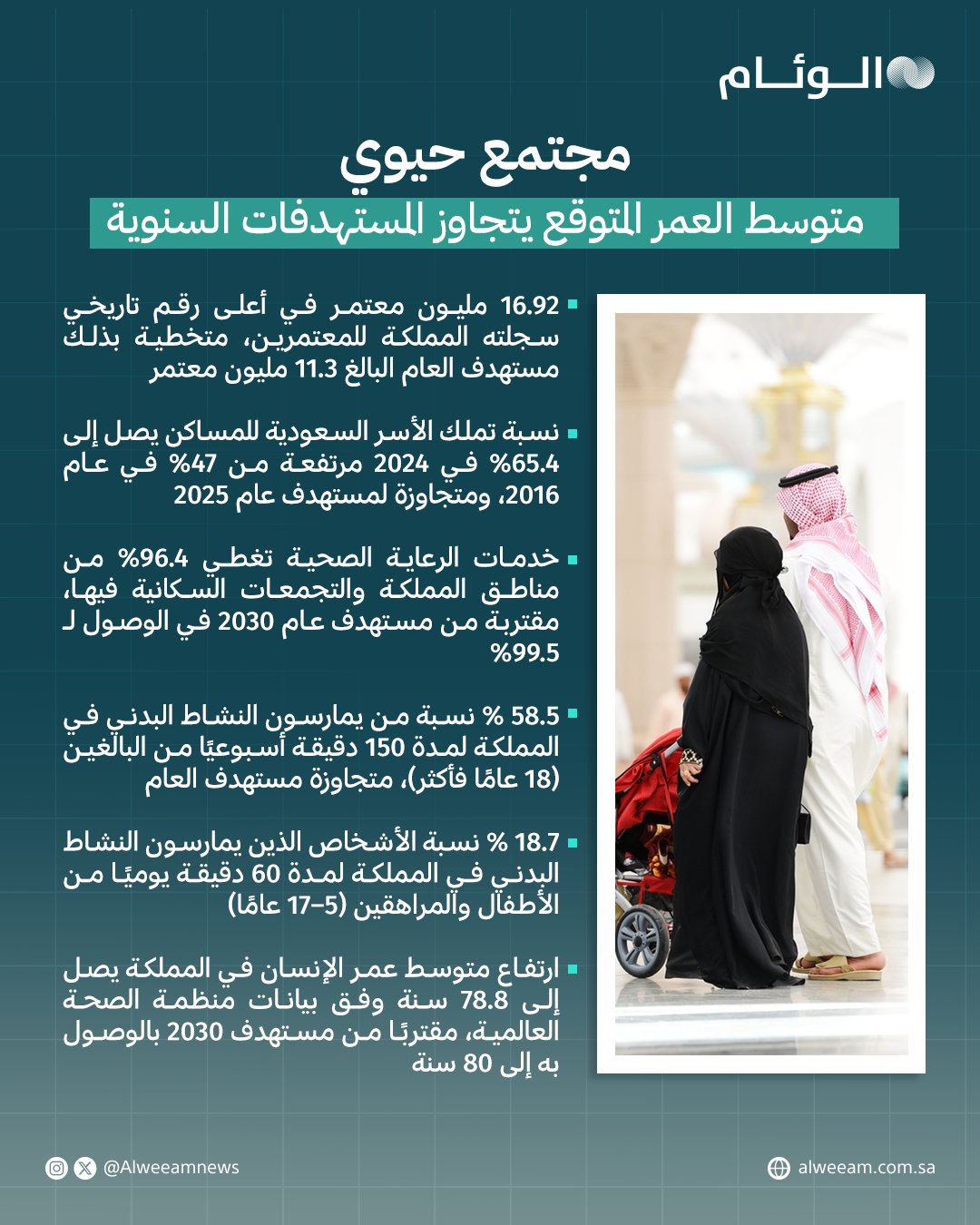 إنفوجرافيك | مجتمع حيوي.. متوسط العمر المتوقع يتجاوز المستهدفات السنوية #السعودية