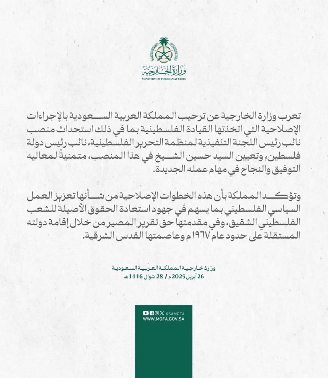 وزارة الخارجية تعرب عن ترحيب المملكة العربية السعودية بالإجراءات الإصلاحية التي اتخذتها القيادة الفلسطينية بما في ذلك استحداث منصب نائب رئيس اللجنة التنفيذية لمنظمة التحرير الفلسطينية، نائب رئيس دولة فلسطين، وتعيين السيد حسين الشيخ في هذا المنصب، متمنيةً لمعاليه التوفيق والنجاح في مهام عمله الجديدة