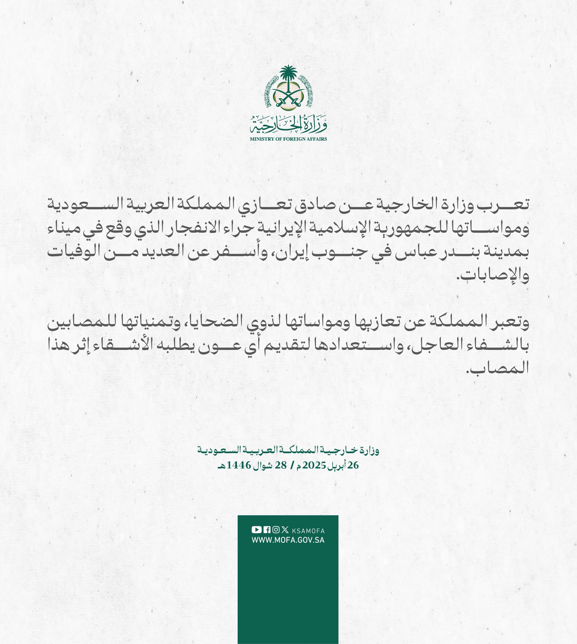 وزارة الخارجية تعري عن صادق تعازي المملكة ومواساتها للجمهورية الإسلامية الإيرانية جراء الانفجار الذي وقع في ميناء بمدينة بندر عباس في جنوب إيران، وأسفر عن العديد من الوفيات والإصابات.