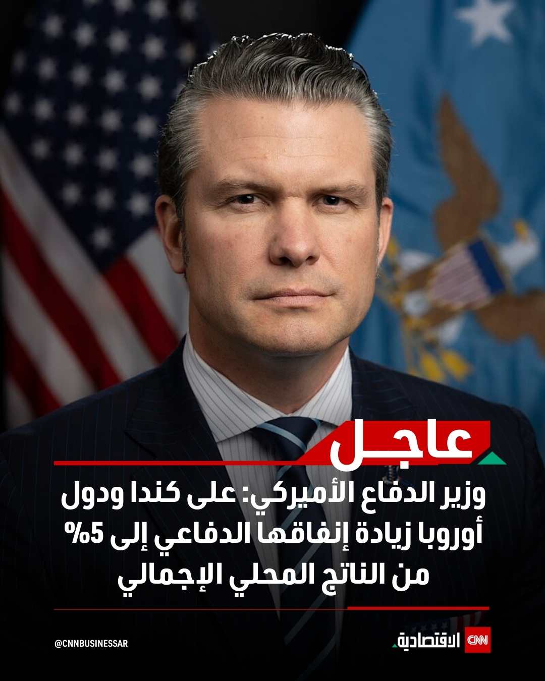 عاجل | وزير الدفاع الأميركي: على كندا ودول أوروبا زيادة إنفاقها الدفاعي إلى 5% من الناتج المحلي الإجمالي #العالم_بلغة_الأعمال