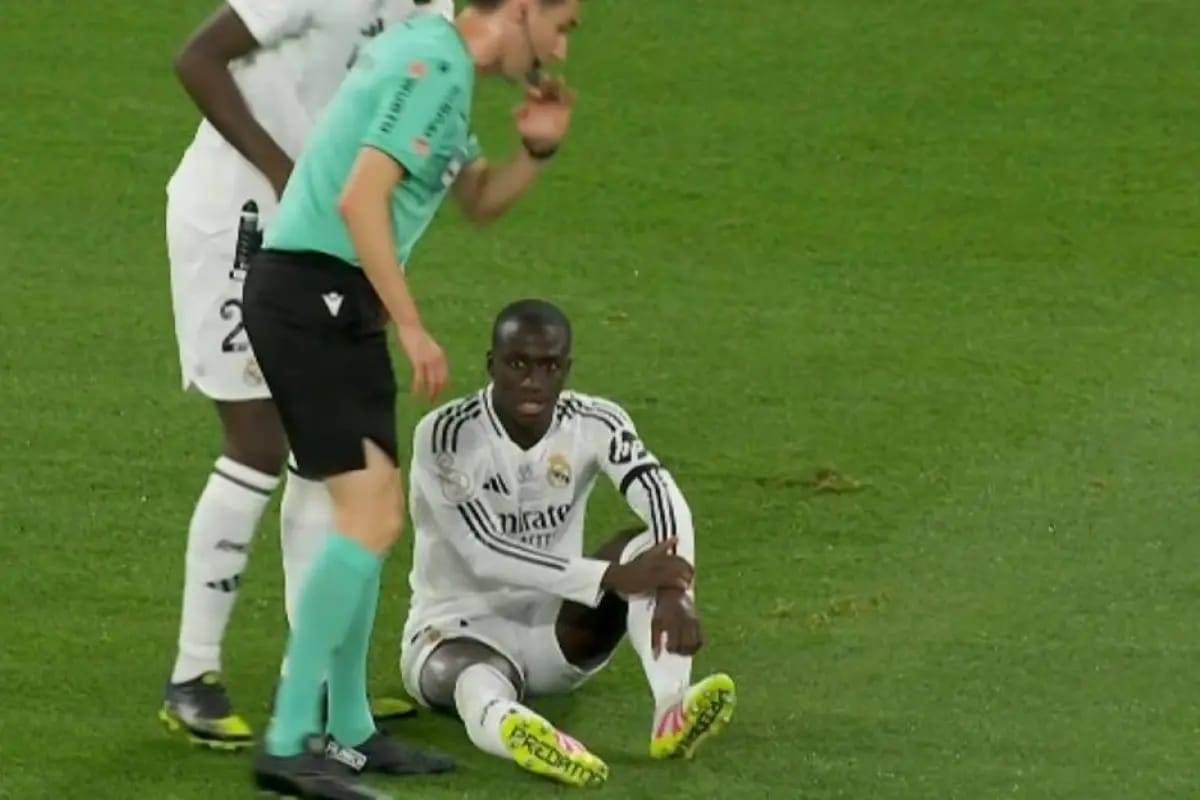 فيرلاند ميندي يغادر الكلاسيكو بين ريال مدريد و برشلونة بعد 9 دقائق فقط بداعي الإصابة.