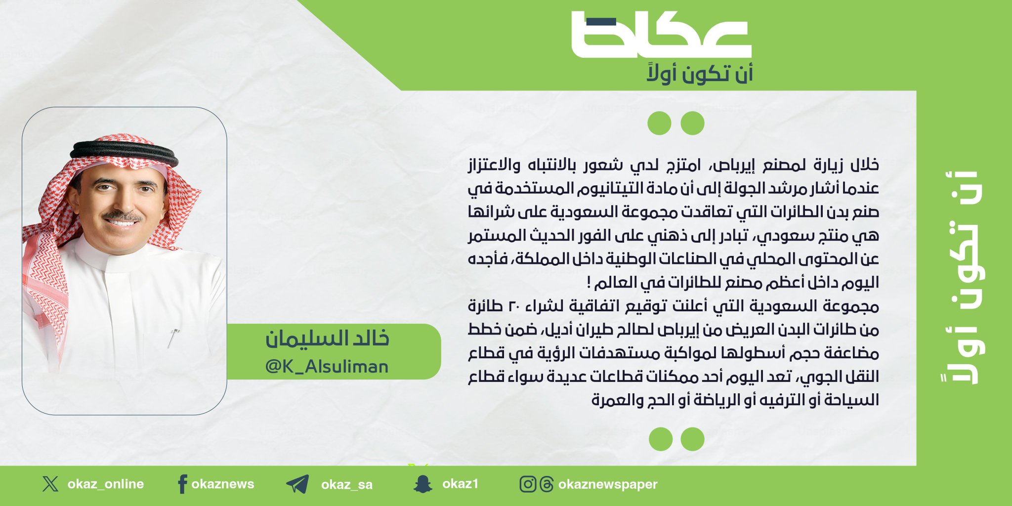 خلال زيارة لمصنع إيرباص، امتزج لدي شعور بالانتباه والاعتزاز عندما أشار مرشد الجولة إلى أن مادة التيتانيوم المستخدمة في صنع بدن الطائرات التي تعاقدت مجموعة السعودية على شرائها هي منتج سعودي، تبادر إلى ذهني على الفور الحديث المستمر عن المحتوى المحلي في الصناعات الوطنية داخل المملكة، فأجده اليوم داخل أعظم مصنع للطائرات في العالم !