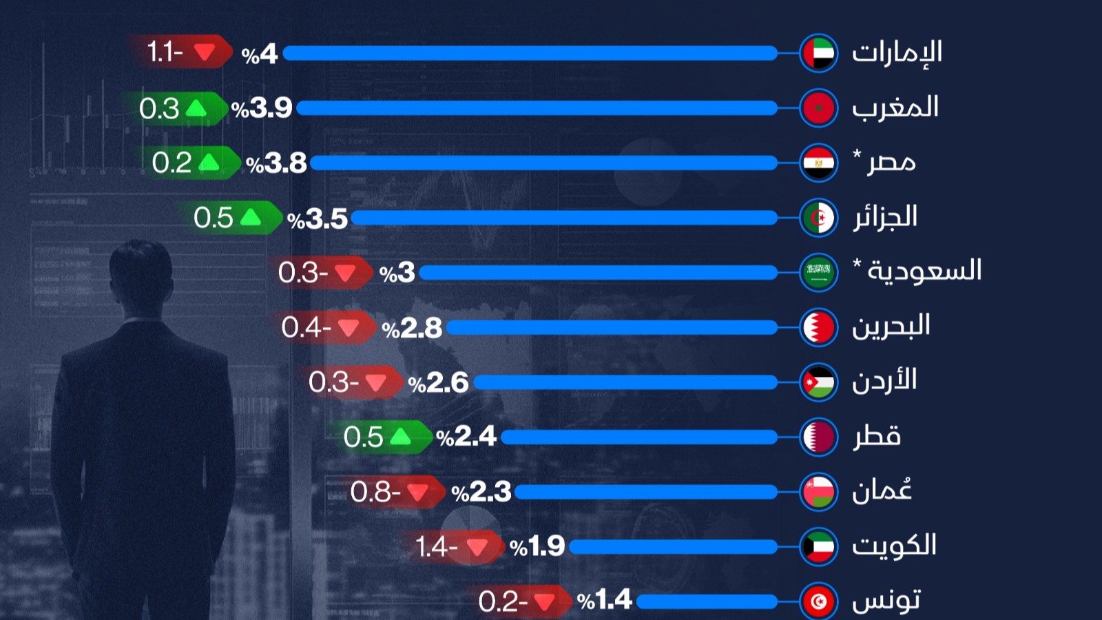 أما التوقعات الإيجابية، فكانت من نصيب اقتصاد المغرب، إذ رفع الصندوق توقعاته بواقع 0.3%إلى 3.9%، كما رفع توقعات نمو الاقتصاد المصري 0.2% ليسجل 2.8%. كذلك رفع صندوق النقد توقعاته لنمو اقتصادي الجزائر وقطر.....