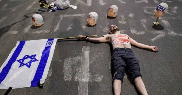 دان رئيس الوزراء الإسرائيلي بنيامين نتنياهو عرض رؤوس مقطوعة مزيفة تحمل وجهه، حول متظاهر يرتدي ضمادات مزيفة ملطخة باللون الأحمر، أثناء مظاهرة مناهضة للحكومة في تل أبيب مساء السبت.