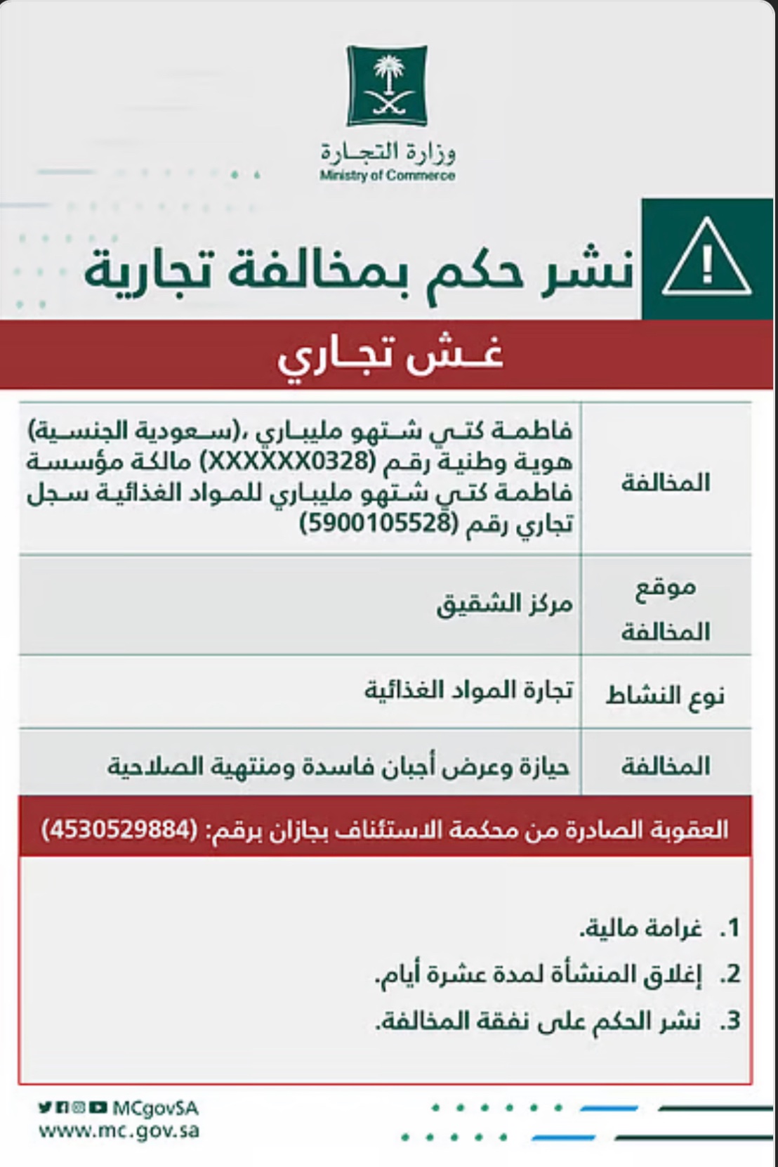 شهّرت وزارة التجارة بصاحبة منشأة تجارية بعد صدور حكم قضائي نهائي يدينها بمخالفة نظام مكافحة الغش التجاري؛ نتيجة حيازة وعرض منتجات أجبان فاسدة ومنتهية الصلاحية.