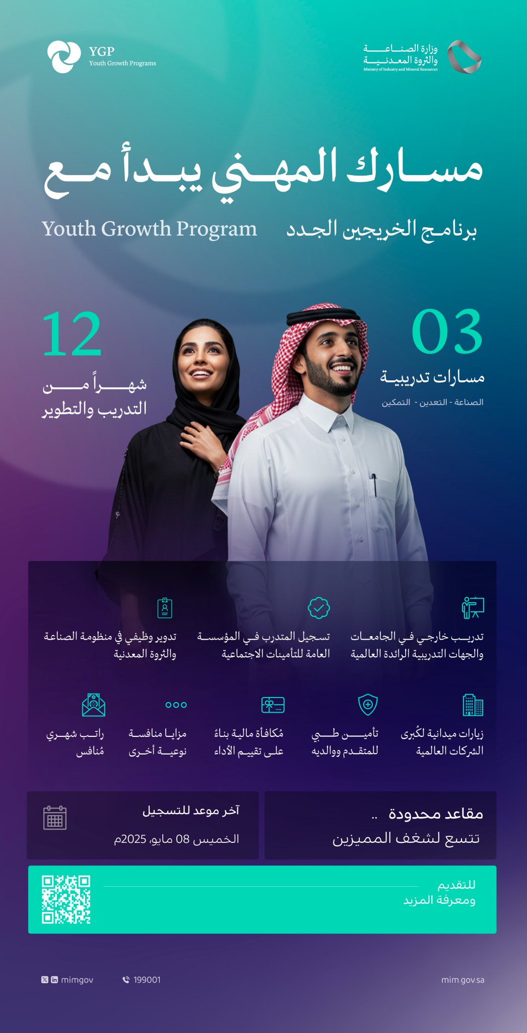أعلنت وزارة الصناعة والثروة المعدنية، بدء التسجيل في برنامج تطوير الخريجين الجدد المنتهي Youth growth program لعام 2025 بنسخته الثانية، الذي يستهدف استقطاب الكفاءات والمواهب الشابة، وإكسابها المهارات اللازمة للتعامل مع أحدث التقنيات، عبر إلحاقها في برامج تدريبية تعزّز قدراتها وإمكاناتها، في إطار جهود الوزارة لتنمية القدرات البشرية في قطاعي الصناعة والتعدين.