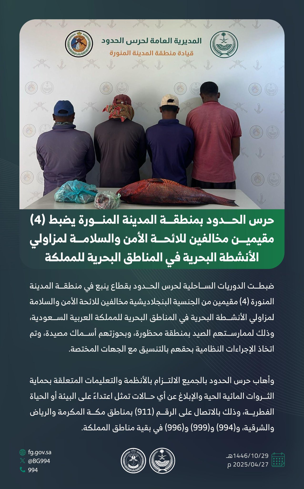 ضبطت الدوريات الساحلية لحرس الحدود بقطاع ينبع في منطقة المدينة المنورة (4) مقيمين من الجنسية البنجلاديشية مخالفين للائحة الأمن والسلامة لمزاولي الأنشطة البحرية في المناطق البحرية للمملكة العربية السعودية، وذلك لممارستهم الصيد بمنطقة محظورة، وبحوزتهم أسماك مصيدة، واتخذت بحقهم الإجراءات النظامية بالتنسيق مع الجهات المختصة.