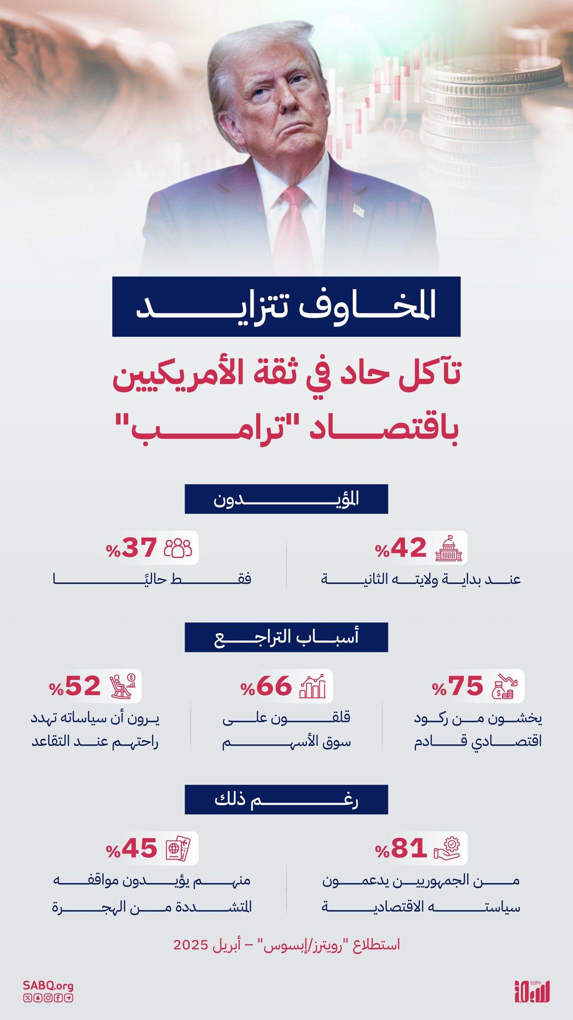 تراجع تأييد دونالد ترامب إلى 37% فقط وسط مخاوف من ركود اقتصادي وارتفاع تكاليف المعيشة، حتى بين الجمهوريين