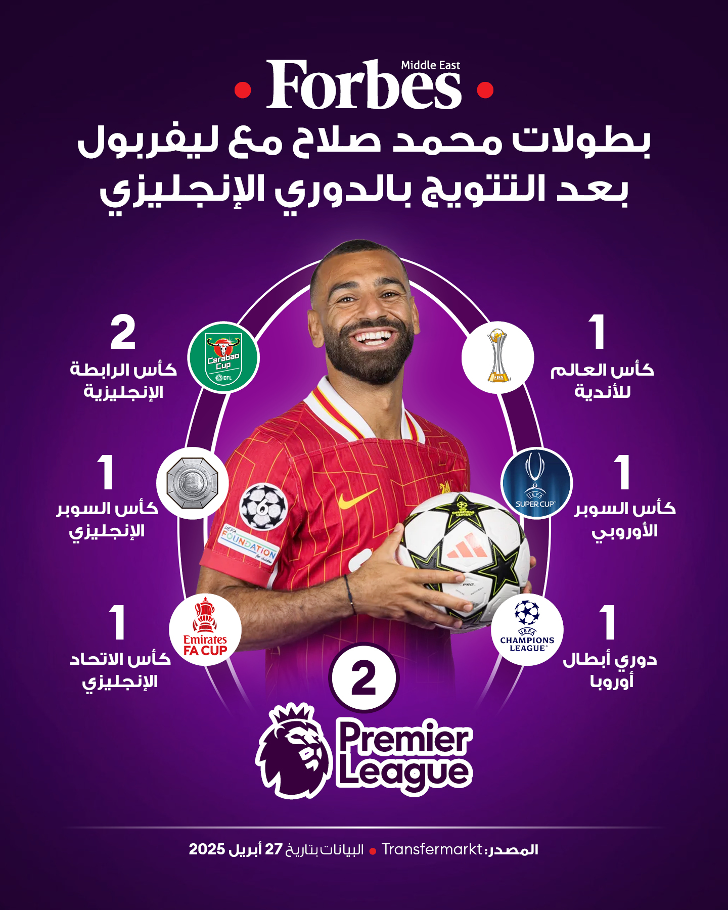 محمد صلاح، نجم الكرة المصرية بقيمة سوقية تبلغ 62.7 مليون دولار، يواصل كتابة التاريخ مع ليفربول بتحقيق لقبه الثاني في الدوري الإنجليزي والتاسع في مسيرته مع النادي، ليعزز مكانته بين أساطير الريدز والعالم. #فوربس