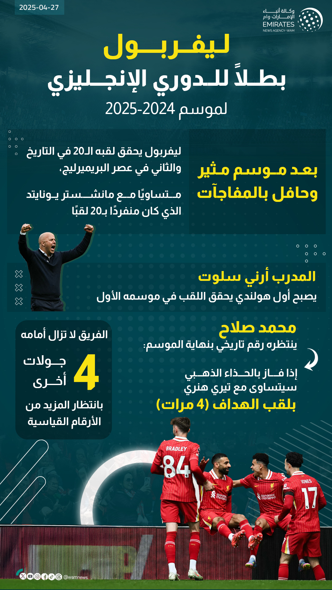 ليفربول يحقق لقبه ال20 في التاريخ، والثاني في عصر البريميرليج #إنفوجرافيك_وام