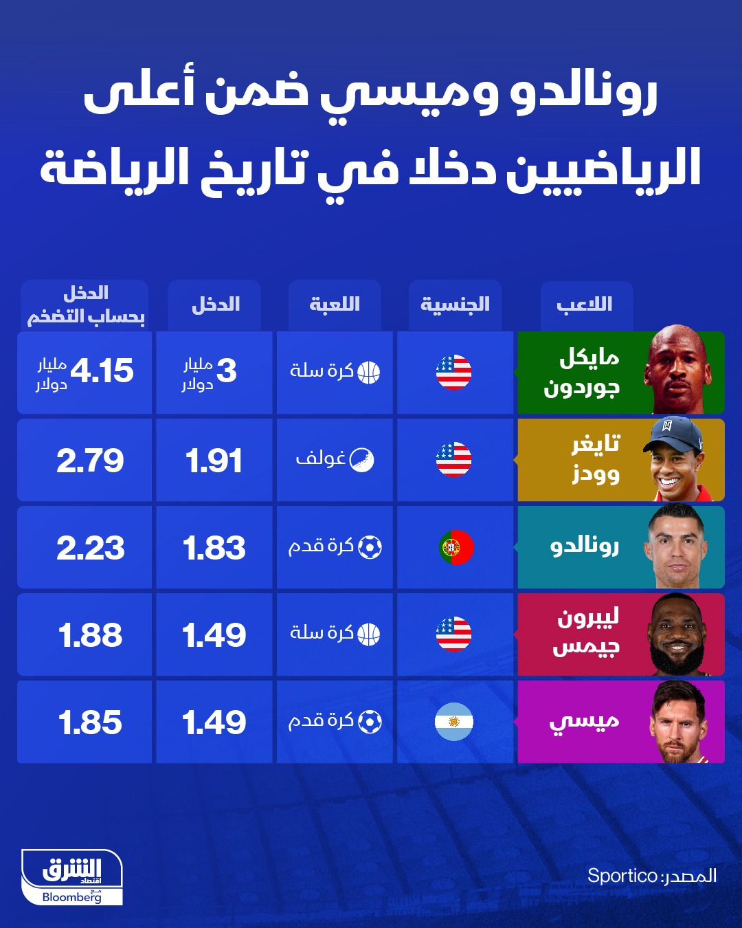 البرتغالي رونالدو والأرجنتيني ميسي تصدرا قائمة لاعبي كرة القدم الأعلى دخلاً في تاريخ اللعبة #الشرق_رياضة