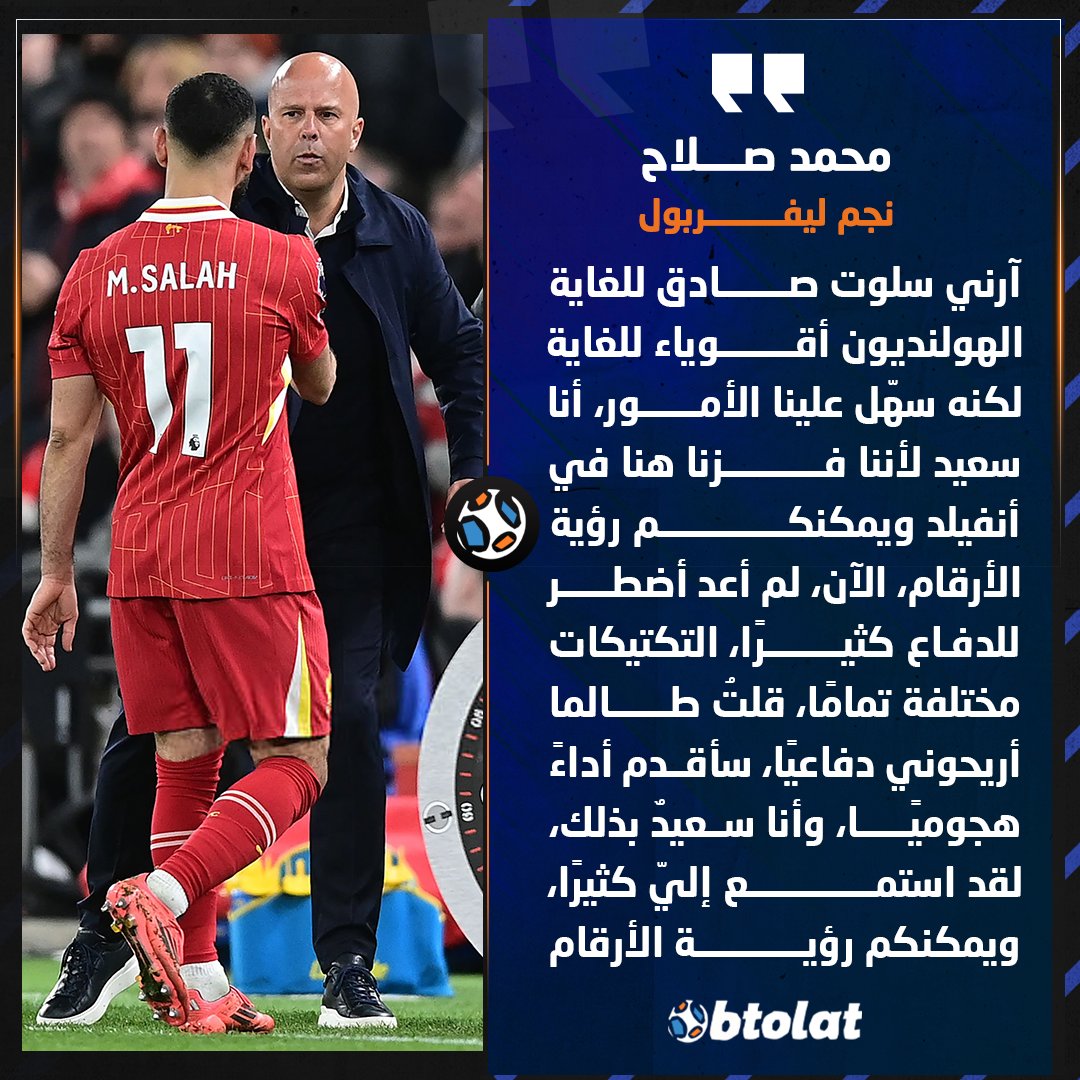 محمد صلاح: آرني سلوت صادق للغاية وسهّل علينا الأمور وأنا لم أعد أضطر للدفاع كثيرًا، قلتُ طالما أريحوني دفاعيًا، سأقدم أداءً هجوميًا، وأنا سعيدٌ بذلك، لقد استمع إليّ كثيرًا، ويمكنكم رؤية الأرقام