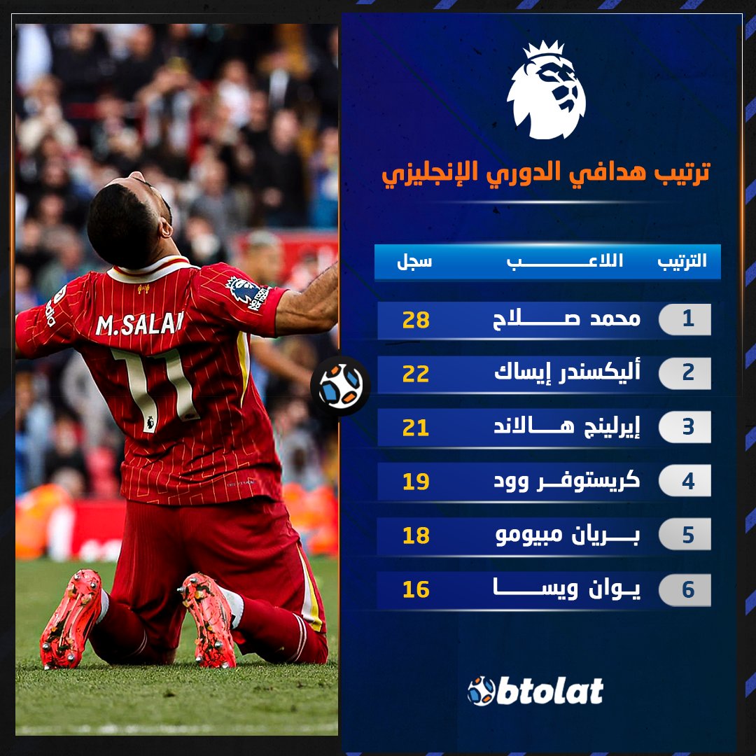 الأفضل في كل شئ .. موسم تاريخي للفرعون المصري. ترتيب هدافي البريميرليج بعد تسجيل "محمد صلاح" هدف في شباك توتنهام