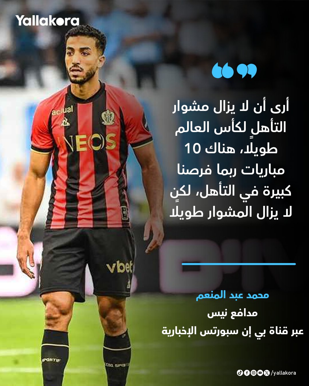 محمد عبد المنعم: أرى أن لا يزال مشوار التأهل لكأس العالم طويلًا، هناك 10 مباريات ربما فرصنا كبيرة في التأهل، لكن لا يزال المشوار طويلًا، من الفخر أن تصنع شيء لمنتخب بلدك هذا شعور مختلف، ونحن قادرون على ذلك