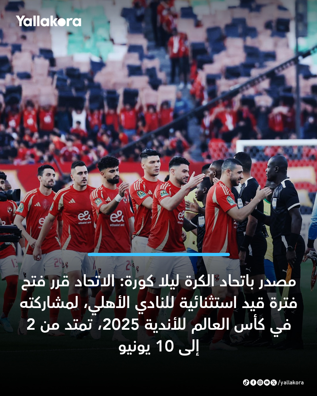 مصدر باتحاد الكرة ليلا كورة: الاتحاد قرر فتح فترة قيد استثنائية للنادي الأهلي، لمشاركته في كأس العالم للأندية 2025، تمتد من 2 إلى 10 يونيو