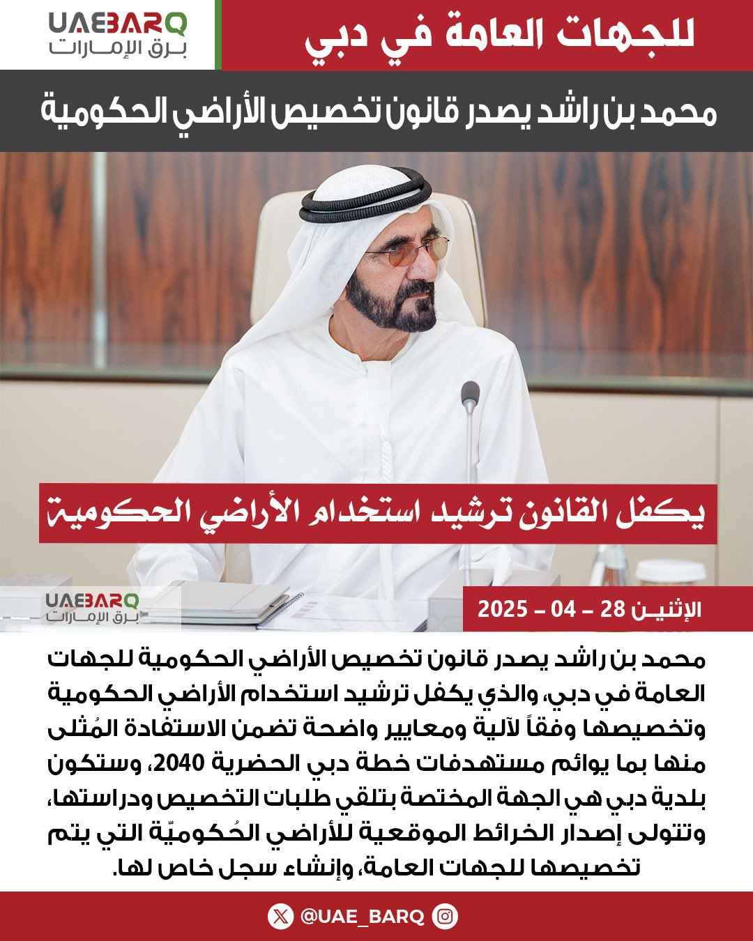 محمد بن راشد يصدر قانون تخصيص الأراضي الحكومية للجهات العامة في #دبي.