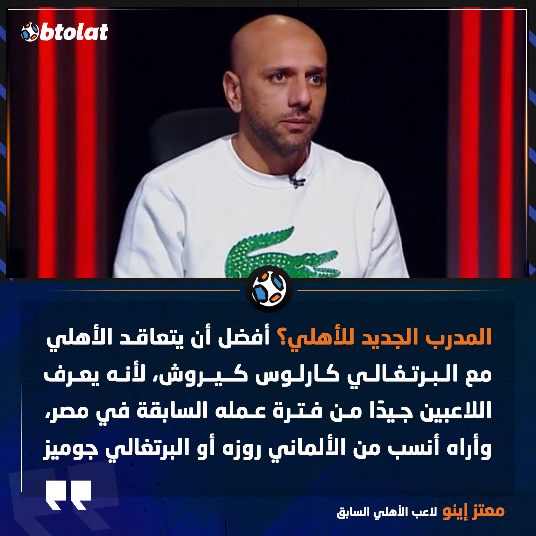 معتز إينو عن المدرب الجديد للأهلي. أفضل أن يتعاقد الأهلي مع البرتغالي كارلوس كيروش، لأنه يعرف اللاعبين جيدًا من فترة عمله السابقة في مصر، وأراه أنسب من الألماني روزه أو البرتغالي جوميز