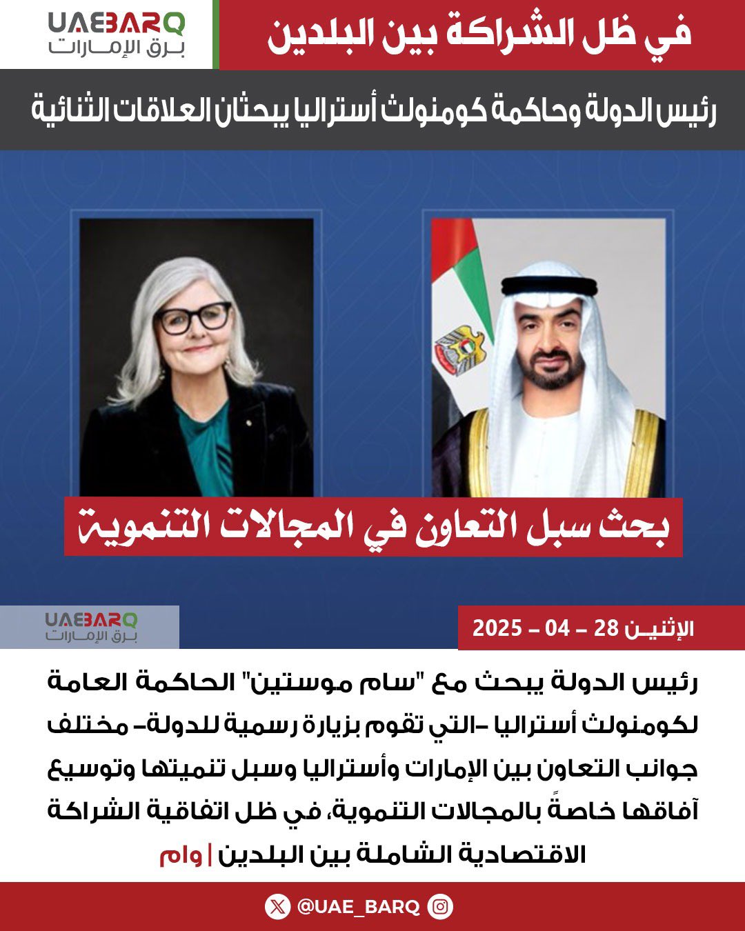 رئيس الدولة وحاكمة كومنولث أستراليا يبحثان العلاقات الثنائية | وام