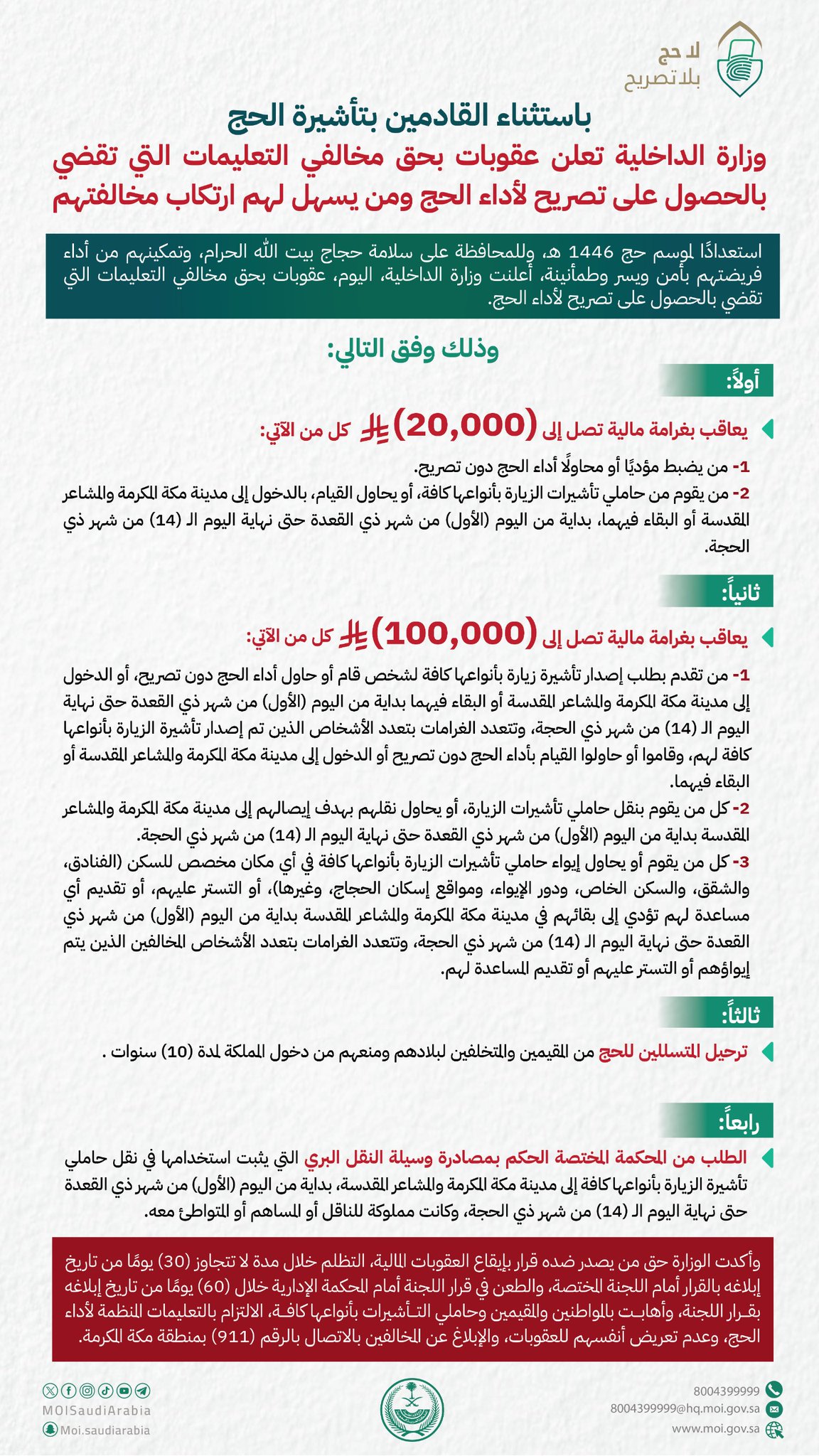 وزارة الداخلية تعلن عقوبات تصل إلى (100,000) ريال لمخالفي أنظمة وتعليمات الحج. #عاجل