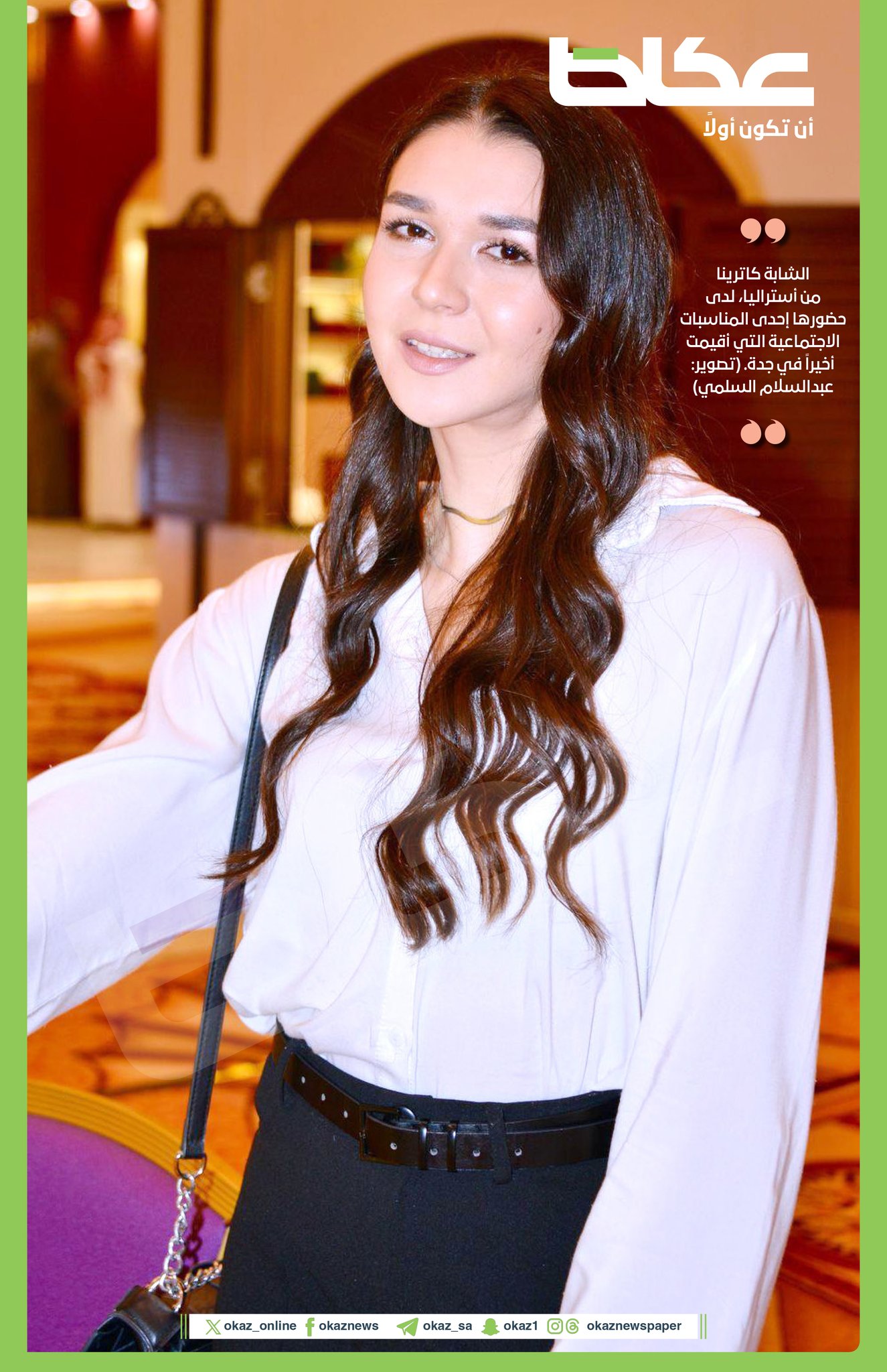 صورة اليوم الشابة كاترينا من أستراليا، لدى حضورها إحدى المناسبات الاجتماعية التي أقيمت أخيراً في جدة.. عبدالسلام السلمي